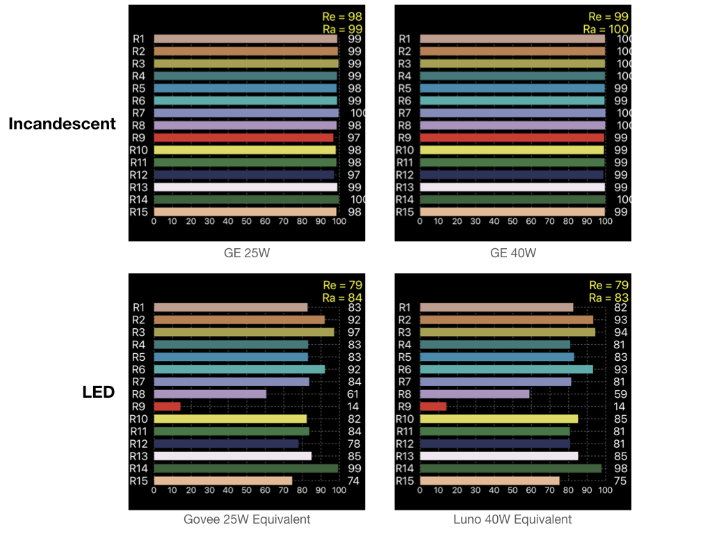 Color rendering index (CRI) of incandescent GE bulbs and LED equivalents by Govee and Luno