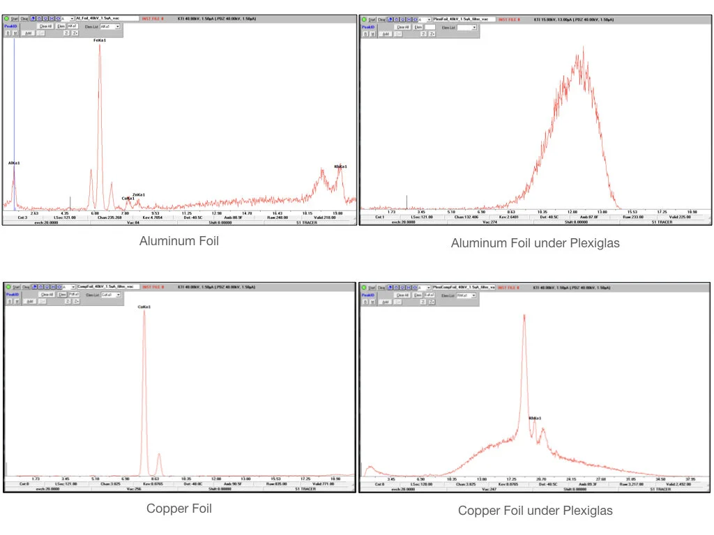 X-ray fluorescence (XRF) spectra of aluminum foil and copper foil, with and without Plexiglas, as controls to determine interference of 1/4" Plexiglas